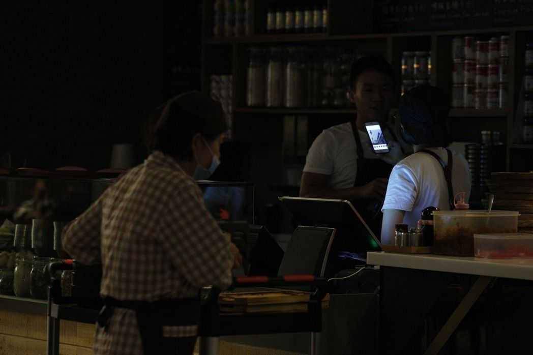 臺北101大樓停電,美食街的民眾摸黑用餐。(圖片來源:臺灣《聯合報》)