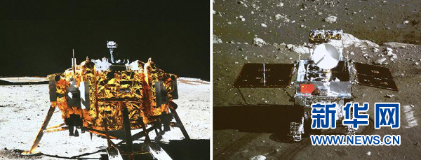12月15日晚,正在月球上開展科學探測工作的嫦娥三號著陸器和巡視器進行互成像實驗,“兩器”順利互拍,嫦娥三號任務取得圓滿成功。未來幾天,在進行科學探測的同時,“玉兔”號月球車還將繞陸器繼續(xù)行駛,從不同角度與著陸器多次互拍。這是北京飛控中心大屏幕上顯示的嫦娥三號著陸器、巡視器互拍成像(拼版照片)。 新華社記者丁林攝