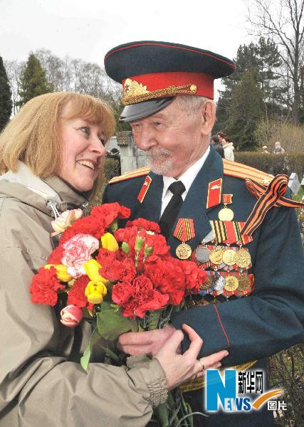 5月9日,在愛沙尼亞首都塔林,一名參加二戰(zhàn)的老戰(zhàn)士接受人們的祝福。當天,愛沙尼亞舉行各種活動,慶祝世界反法西斯戰(zhàn)爭勝利65周年。新華社發(fā)(維克托攝)