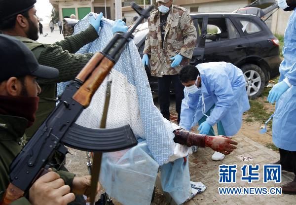 3月19日,在利比亞城市班加西,醫護人員在為一名政府軍士兵處理傷情。據利比亞電視臺當日報道,班加西市的居民已經把反政府武裝人員從該市三分之二的區域趕跑。當地居民在市中心的刑事法院辦公大樓升起了利比亞國旗。新華社/路透