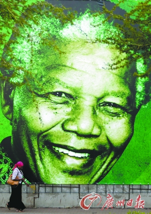 在南非比勒陀利亞的大街上,一面墻上掛著曼德拉的肖像。