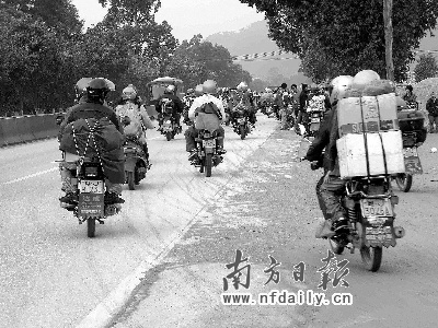 戴上頭盔、披上雨衣、載上家人,回家過年。春節臨近,由佛山、東莞、廣州等珠三角城市返鄉農民工組成的10萬“摩托車返鄉大軍”,沿著321國道返回廣西、貴州、湖南和四川老家過年。他們穿著厚實的棉衣,結實的綁腿,棉質護膝,防風頭盔,皮手套,或成群結隊,或獨馬單騎,車上大多數是小兩口子,或者夾帶一個小孩,奔馳在國道上,成了春運交通線上一道道特殊的風景。