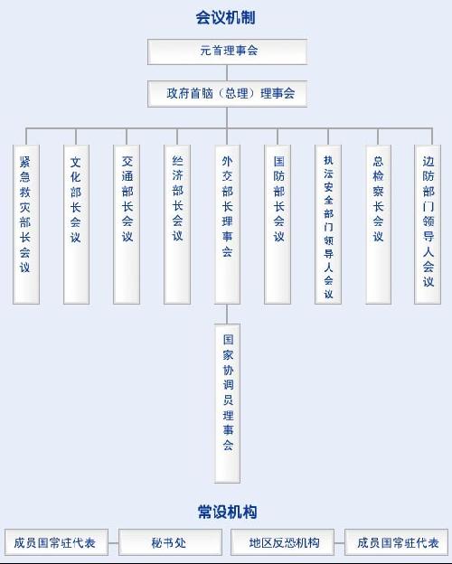 在元首和政府首腦理事會下面,還分別設有外長、經濟、交通、文化、國防、執法安全、監察、民政、邊防等年度定期會晤機制。