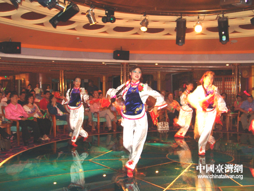 世紀之星郵輪上工作人員的節(jié)目是聯(lián)歡會的重頭戲。員工們準備了近十個節(jié)目獻給遠道而來的客人。當《 阿里山的姑娘》的歌舞跳起時,一位來自臺灣的代表興致所至,上臺與川妹子們舞到了一起。