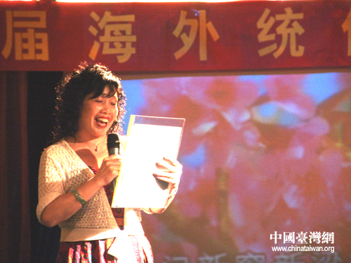 洪光良會長在聯歡會上朗誦了自己在分組交流后即興所做的組詩《同船之歌》。“嘉陵長江匯成流 ,兩岸分隔我心憂,世紀之星能載重,難載分離骨肉愁……地緣血緣緣不盡,和平統一憶萬秋。”“抽刀斷水水更流,兩岸一家留更留,炎黃子孫遍天下,百尺竿頭上層樓……”他情深意切的朗誦感染著臺下的眾多會長。