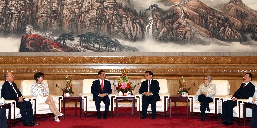 4月16日,中共中央總書記胡錦濤在北京人民大會堂會見中國國民黨榮譽主席連戰和參加兩岸經貿論壇的臺灣各界人士。新華社記者樊如鈞攝