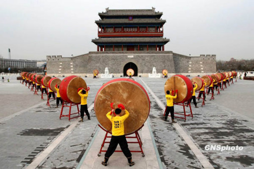12月12日是氣候變化全球行動日(Global Day of Action),國際環(huán)保組織綠色和平聯(lián)同北京20名鼓手,在北京古老的永定門城樓前擂響巨鼓,用震耳欲聾的鏗鏘鼓聲助威正在哥本哈根召開的全球氣候大會。鼓手們以中國傳統(tǒng)的擂鼓助威方式,通過凝重急促的鼓聲向全世界發(fā)出警告:“拯救氣候,刻不容緩”。