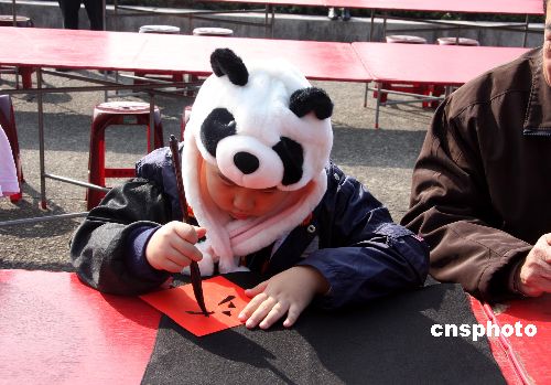 1月18日,臺灣2009己丑年全民迎新春聯(lián)揮毫在臺北“國父紀念館”舉行。圖為一名戴熊貓頭套的學童正在認真寫聯(lián)。中新社發(fā) 陳立宇 攝