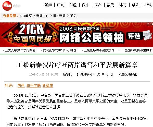 新華網北京1月23日電(記者陳斌華 茆雷磊)中共中央臺辦、國務院臺辦主任王毅23日向臺灣同胞發表了題為《兩岸同胞共同譜寫和平發展新篇章》的新春賀辭。