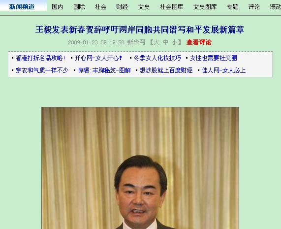 北京1月23日電(記者陳斌華 茆雷磊)中共中央臺辦、國務院臺辦主任王毅23日向臺灣同胞發表了題為《兩岸同胞共同譜寫和平發展新篇章》的新春賀辭。