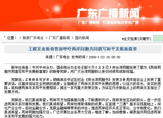 [廣東電臺]王毅發表新春賀辭呼吁兩岸同胞共同譜寫和平發展新篇章