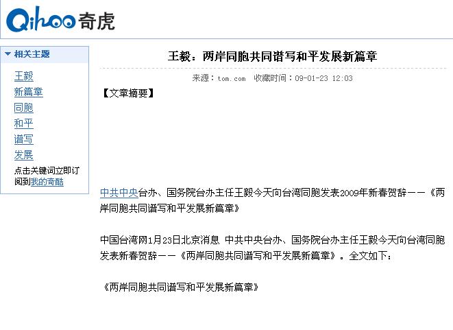 中共中央臺辦、國務院臺辦主任王毅今天向臺灣同胞發表2009年新春賀辭――《兩岸同胞共同譜寫和平發展新篇章》