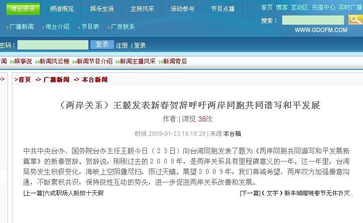 中共中央臺辦、國務院臺辦主任王毅今日(23日)向臺灣同胞發表了題為《兩岸同胞共同譜寫和平發展新篇章》的新春賀辭。賀辭說,剛剛過去的2008年,是兩岸關系具有里程碑意義的一年。這一年里,臺灣局勢發生積極變化,海峽上空陰霾盡掃,雨過天晴。展望2009年,我們真誠希望,兩岸雙方加強善意溝通,不斷累積共識,保持良性互動的勢頭,進一步促進兩岸關系改善和發展。