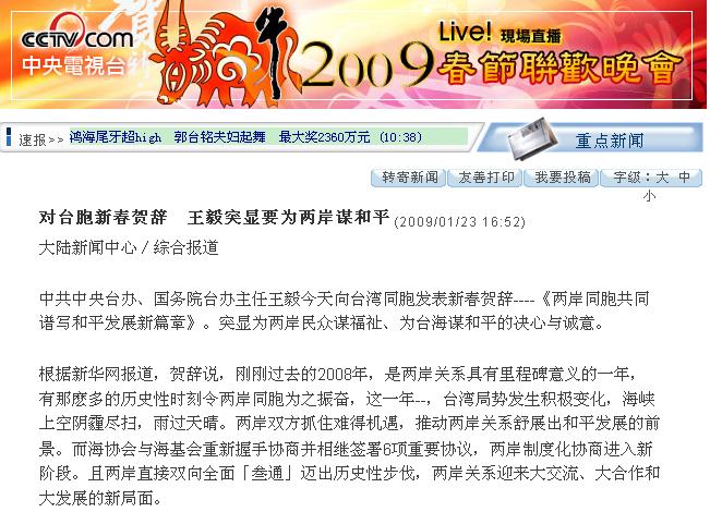 中共中央臺辦、國務院臺辦主任王毅今天向臺灣同胞發表新春賀辭----《兩岸同胞共同譜寫和平發展新篇章》。突顯為兩岸民眾謀福祉、為臺海謀和平的決心與誠意。