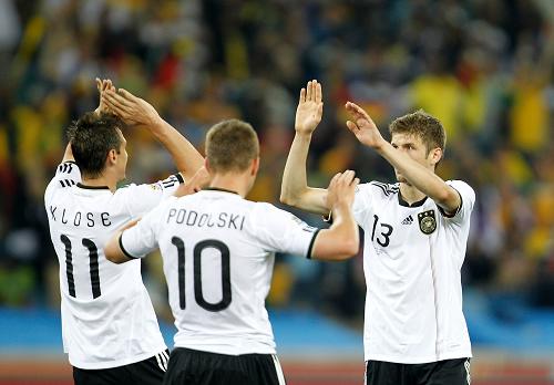 德國隊球員穆勒(右)進球后與隊友克洛澤(左)、波多爾斯基慶祝。當(dāng)日,在德班進行的2010年南非世界杯D組首輪比賽中,德國隊迎戰(zhàn)澳大利亞隊。新華社記者廖宇杰攝
