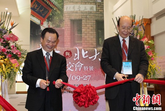 應臺灣大學邀請,校長周其鳳率北京大學134人代表團訪問臺灣,展開北大歷史上規(guī)模最大的校際交流活動,并于9日在臺大開展“北京大學日”系列活動。圖為周其鳳(左2)與臺大校長李嗣涔(左1)參觀展覽。中新社發(fā) 路梅 攝