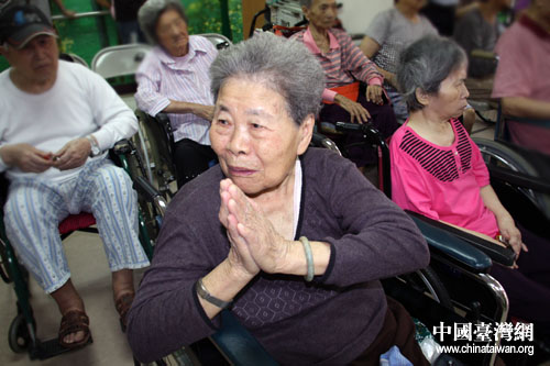 “高山青、澗水藍(lán)……”在“超女”李娜悠揚(yáng)及極富帶動(dòng)性的歌聲中,嘉義利河伯養(yǎng)老院的70余位老人一起唱起了這首傳唱度極高的報(bào)道歌曲。“哈利路亞,”生活在這里的張林滿老人在歌聲中淚流滿面,“這是我很熟悉的旋律,她長(zhǎng)的很清秀,看到她活潑的樣子就像看到了自己的孩子一樣,很溫暖”。雖然老人夾雜著閩南語的普通話記者并不能完全聽懂,但她眼中的淚水卻代表了千言萬語。