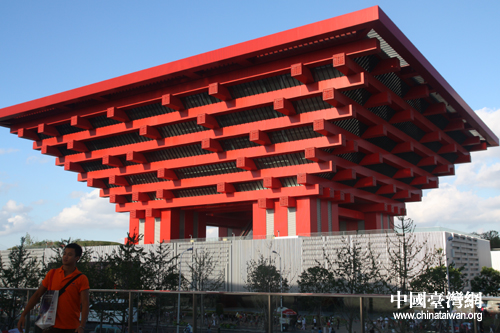 同學們一個接一個地在雄偉的中國館前拍照留念。(中國臺灣網 肖燕 攝)