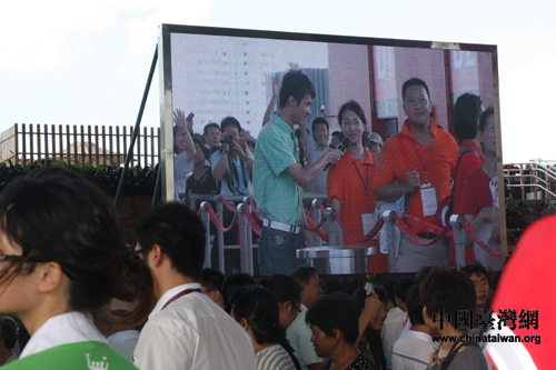 排隊等候進館期間,一位同學接受中國館表演區主持人的現場采訪。(中國臺灣網 肖燕 攝)