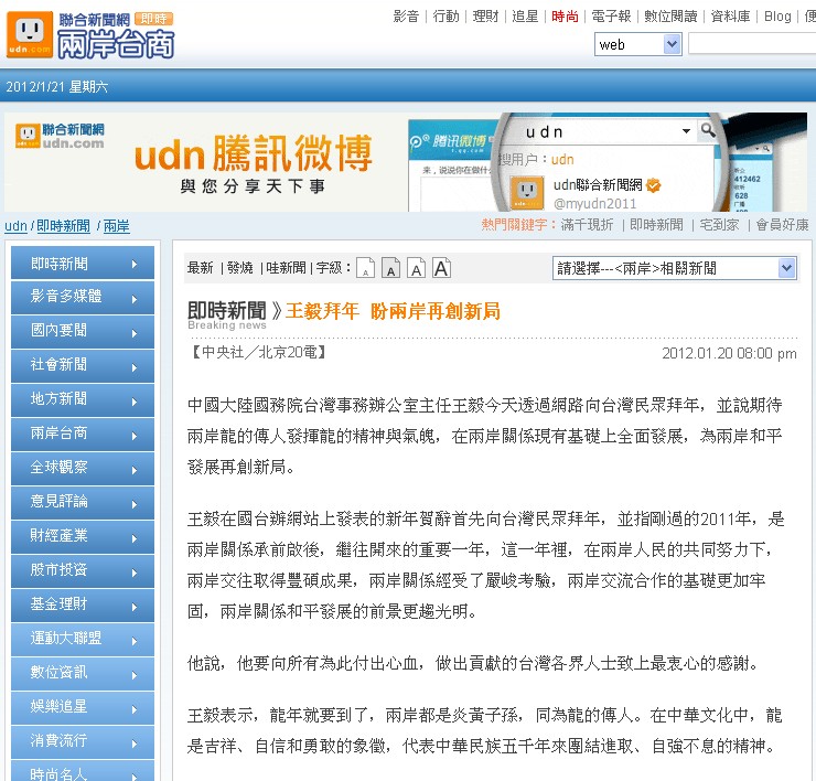 中國大陸國務(wù)院臺灣事務(wù)辦公室主任王毅今天透過網(wǎng)路向臺灣民眾拜年,並說期待兩岸龍的傳人發(fā)揮龍的精神與氣魄,在兩岸關(guān)係現(xiàn)有基礎(chǔ)上全面發(fā)展,為兩岸和平發(fā)展再創(chuàng)新局。