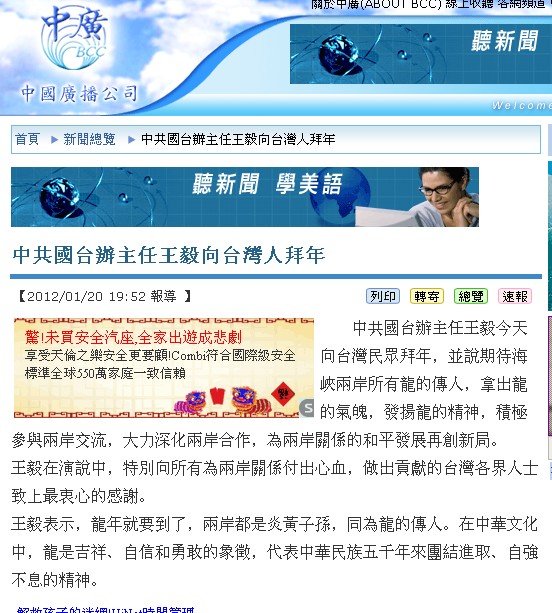中共國臺辦主任王毅今天向臺灣民眾拜年,並說期待海峽兩岸所有龍的傳人,拿出龍的氣魄,發(fā)揚龍的精神,積極參與兩岸交流,大力深化兩岸合作,為兩岸關係的和平發(fā)展再創(chuàng)新局。
