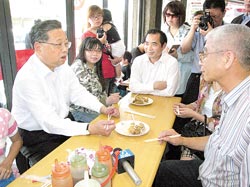 福建省長(zhǎng)黃小晶(左一)在臺(tái)南市安平街區(qū)一家知名蝦卷店,邀請(qǐng)臺(tái)灣民眾一起享用美味的點(diǎn)心。圖片來源:臺(tái)灣《中國(guó)時(shí)報(bào)》