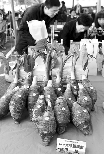 2月19日,“遼寧采購臺灣農(nóng)特產(chǎn)品簽約啟運(yùn)儀式”在臺中果菜市場舉行,現(xiàn)場簽訂采購協(xié)議總金額約4000萬元新臺幣。首批裝滿臺中茂谷柑、蜂蜜等當(dāng)?shù)貎?yōu)良農(nóng)特產(chǎn)品的5輛貨柜車隨即啟運(yùn),將由臺中港直接運(yùn)往遼寧。圖為儀式現(xiàn)場展示的臺中特產(chǎn)大甲芋頭。新華社記者 宋立東攝