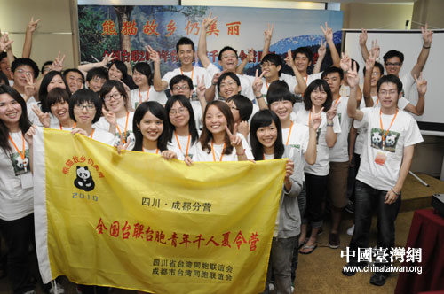 中國臺灣網7月12日成都消息 7月11日下午,全國臺聯2010年臺胞青年千人夏令營四川·成都分營——“熊貓故鄉仍美麗”活動在成都隆重開營。來自海峽兩岸的臺灣大學、政治大學、世新大學、東吳大學、四川大學、上海海事大學等25所高校的近50名大學生參加了開營式。四川省臺辦機關黨委書記楊永培、省臺聯會長劉琪出席開營儀式,省臺聯副會長陳開明主持開營儀式。