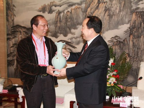 平頂山市長李恩東將著名汝瓷作為禮物送給劉大釧先生(中國臺灣網(wǎng) 宿靜 攝)