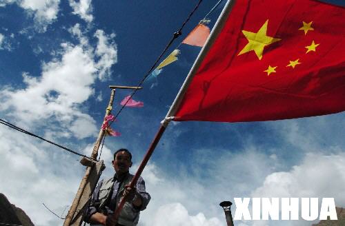 6月30日,西藏堆龍德慶縣的藏族農民在掛五星紅旗。當日,青藏鐵路沿線的藏族群眾紛紛掛起國旗,喜迎青藏鐵路7月1日全線通車。(新華社記者楊俊江攝)