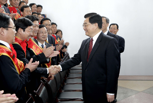 7月1日,中共中央總書記、國家主席、中央軍委主席胡錦濤專程前往青海省格爾木市出席青藏鐵路通車慶祝大會。這是胡錦濤在會前親切接見青藏鐵路建設(shè)先進(jìn)集體和先進(jìn)個(gè)人代表。(新華社記者蘭紅光攝)
