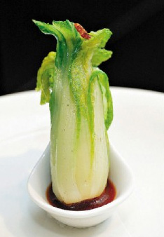 像是游客必看的翠玉白菜,斜倚在小碟子里,主廚蕭廣安選產自臺灣中部的娃娃菜,整棵菜剝掉90%,只取中心葉菜層、長約8到10公分大小。先經過火腿、雞高湯汆燙入味,之后可以淋上XO高湯醬汁熱食、或搭配咸甜的芝麻醬汁當開胃冷食,主廚更以櫻花蝦替代螽斯和蝗蟲,食趣十足。