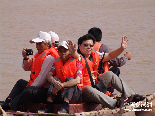 7月10日,在寧夏參加“海峽兩岸記者聯(lián)合采訪活動(dòng)”的兩岸記者一行參觀游覽沙坡頭旅游區(qū)治沙工程。圖為記者乘羊皮筏在黃河漂流。
