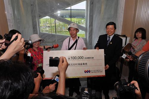 5月25日,第十萬(wàn)名游客劉云祥(中)高興地接受記者采訪。新華社記者 何俊昌 攝