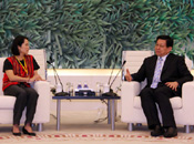 中共中央總書記胡錦濤19日下午在人民大會(huì)堂會(huì)見了高金素梅率領(lǐng)的臺(tái)灣少數(shù)民族代表團(tuán)全體成員,并發(fā)表了即席講話。
