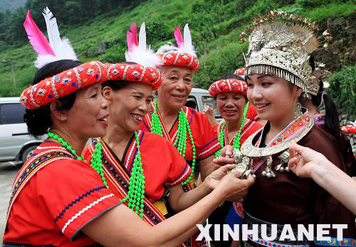 8月13日,在廣西桂林市龍勝各族自治縣大唐灣民族村,來自臺灣的少數民族同胞觀賞當地侗家女的銀飾。 當日,參加“2009桂臺少數民族交流周”的臺灣少數民族同胞,來到廣西龍勝縣大唐灣民族村,與當地少數民族群眾進行民俗文化交流,增進兩岸同胞的相互了解和情誼。新華社發(龍濤 攝)