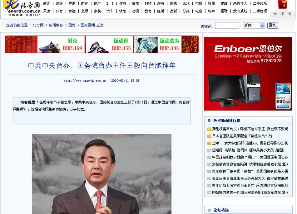 2010年2月11日,中共中央臺辦、國務院臺辦主任王毅通過中國臺灣向臺灣同胞拜年。