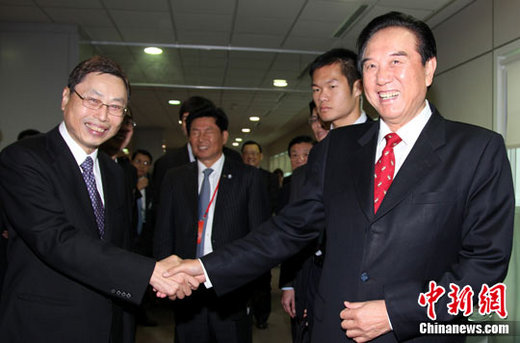 2月28日上午,海協(xié)會(huì)會(huì)長陳云林一行圓滿結(jié)束6天的首次經(jīng)貿(mào)之旅,搭乘中華航空公司班機(jī)離臺(tái)。圖為登機(jī)前,陳云林與前往桃園機(jī)場送行的海基會(huì)副董事長高孔廉握手道別。中新社發(fā) 董會(huì)峰 攝