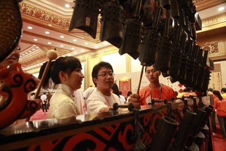 兩岸青年參觀中華非物質文化遺產編鐘展示并親自體驗
