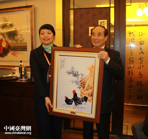 2011年4月18日,臺灣十大杰出青年基金會歡送大陸高校師生參訪團一行,圖為十大杰出青年基金會王金平董事長與中國宋慶齡基金會聯絡部陳愛民部長互換禮物。(中國臺灣網 楊永青 攝)