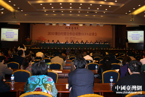 作為“2010河南臺灣月”主要活動之一的“2010年豫臺經(jīng)貿(mào)合作洽談會暨ECFA宣講會”,以“交流·合作·發(fā)展”為主題,以優(yōu)勢產(chǎn)品推介、合作項目對接、實地參觀考察等為主要內(nèi)容。
