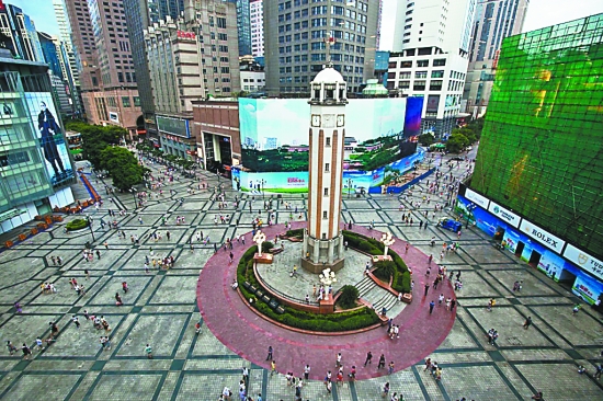 建造于1945年的人民解放紀(jì)念碑標(biāo)志著抵抗日本侵略者之戰(zhàn)的結(jié)束。1950年,重慶對(duì)解放碑進(jìn)行了翻新,直到上世紀(jì)80年代,它一直是當(dāng)?shù)刈罡叩慕ㄖH缃瘢诟邩谴髲B的映襯下,解放碑顯得越發(fā)“嬌小”了。