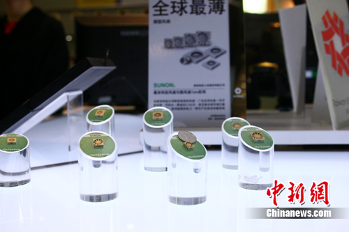 在“臺灣精品館”的精品中,一枚比一角硬幣還小的風扇引來眾多參觀者駐足。“臺灣精品館”相關(guān)負責人告訴記者,這枚全球最薄的微型風扇是臺灣建準科技研發(fā)制造,其厚度僅0.3公分,是全球已量產(chǎn)風扇中最薄的微型風扇,被廣泛應用在新一代平板計算機和手機內(nèi),其使用極微的電力,即可產(chǎn)生良好的散熱效果。