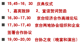 海峽兩岸關(guān)系協(xié)會(huì)會(huì)長 陳云林 國臺(tái)辦常務(wù)副主任 鄭立中 北京市委常委、常務(wù)副市長 吉 林 中共北京市委常委 牛有成 海峽兩岸關(guān)系協(xié)會(huì)常務(wù)副會(huì)長 李炳才 國臺(tái)辦經(jīng)濟(jì)局局長 徐 莽 國臺(tái)辦秘書局局長 楊流昌 北京市臺(tái)辦主任 馬玉萍 全國臺(tái)企聯(lián)會(huì)長 郭山輝 全國臺(tái)企聯(lián)常務(wù)副會(huì)長、秘書長 何世忠 中國國民黨副秘書長 張榮恭 臺(tái)北世貿(mào)中心董事長 王志剛 臺(tái)灣工商協(xié)進(jìn)會(huì)理事長 黃茂雄 臺(tái)灣省農(nóng)會(huì)總干事 張永成 “中國生產(chǎn)力中心”總經(jīng)理 張寶誠 臺(tái)灣金屬工業(yè)研究發(fā)展中心董事長 黃啟川 臺(tái)北市企業(yè)經(jīng)理協(xié)進(jìn)會(huì)理事長 姜志俊 電電公會(huì)總監(jiān) 莊秉鈞 中華海峽兩岸救援協(xié)會(huì)發(fā)起人 曹長齡 臺(tái)灣海峽兩岸觀光旅游協(xié)會(huì)北京辦事處主任 楊瑞宗 北京臺(tái)資企業(yè)協(xié)會(huì)創(chuàng)會(huì)會(huì)長 吳昌明 榮譽(yù)會(huì)長 謝坤宗 現(xiàn)任會(huì)長 林清發(fā) 國臺(tái)辦、海協(xié)會(huì)、臺(tái)盟中央、全國臺(tái)聯(lián)和北京市有關(guān)部門負(fù)責(zé)人;北京市臺(tái)辦歷任主任;全國臺(tái)企聯(lián)和各地臺(tái)協(xié)會(huì)長;臺(tái)灣相關(guān)團(tuán)體代表;北京臺(tái)協(xié)會(huì)員代表;在京臺(tái)生代表等。