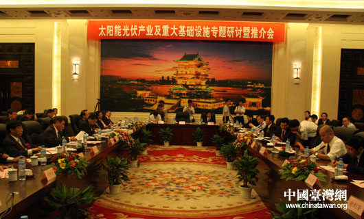 9月21日上午,由國(guó)務(wù)院臺(tái)辦和江西省政府共同主辦的“2009贛臺(tái)經(jīng)貿(mào)合作研討會(huì)”在南昌開(kāi)幕。開(kāi)幕后,兩岸工商企業(yè)代表就有關(guān)投資合作項(xiàng)目及協(xié)議現(xiàn)場(chǎng)簽約,隨后,江西省七個(gè)專題的研討暨項(xiàng)目推介會(huì)同時(shí)展開(kāi)。圖為太陽(yáng)能光伏產(chǎn)業(yè)及重大基礎(chǔ)設(shè)施專題研討會(huì)暨推薦會(huì)現(xiàn)場(chǎng)。(中國(guó)臺(tái)灣網(wǎng) 鐘寶華 攝)