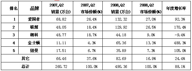 2008年Q2,愛國者依然占據市場第一的寶座,銷售量為132.32萬臺,占據27.0%的市場份額;而聯想不甘落后,通過推出聯想福娃、奧運火炬等閃存盤,跳脫出傳統的降價促銷,大手筆地拉開奧運促銷大幕,占據26.5%的市場份額,二者差距越來越小。