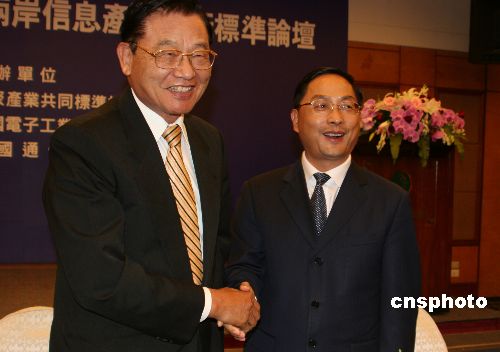 | 5月11日,第二屆“海峽兩岸信息產業(yè)技術標準論壇”在臺北落幕,取得五項進展。圖為華聚產業(yè)共同標準推動基金會董事長江丙坤(左),與來自大陸的信息產業(yè)部副部長蔣耀平握手致意。 |
