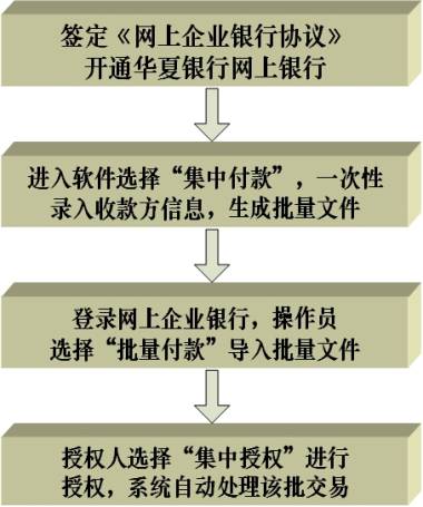 集中付款業務是指付款人在需要向多個收款人支付貨款時,依據與我行簽訂的《華夏銀行集中付款業務合作協議》,向我行提交一張支票(或電匯憑證)和與匯款內容對應的支付清單,同時完成向多個收款人支付款項的結算業務。付款人也可以使用"華夏互連通"集中付款軟件錄入支付信息,通過華夏銀行網上企業銀行一次性向多家收款人進行支付。
