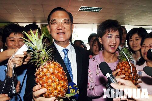 4月20日,中國國民黨榮譽主席連戰參觀廈門臺灣水果銷售集散中心。連戰夫婦稱贊臺灣水果好吃,為臺灣水果做起“廣告”。新華社記者 王建華 攝