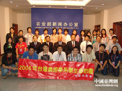中國(guó)臺(tái)灣網(wǎng)6月28日消息 昨天下午,臺(tái)灣青年學(xué)生大陸訪問(wèn)團(tuán)一行33人應(yīng)邀來(lái)農(nóng)業(yè)部參觀訪問(wèn)。參觀訪問(wèn)團(tuán)成員都是在島內(nèi)大學(xué)學(xué)習(xí)獸醫(yī)、畜牧和農(nóng)經(jīng)等專業(yè)的學(xué)生,大陸海峽兩岸農(nóng)業(yè)交流協(xié)會(huì)特別邀請(qǐng)農(nóng)業(yè)部相關(guān)司局的負(fù)責(zé)人、青年干部與臺(tái)灣學(xué)生進(jìn)行了交流,進(jìn)一步增進(jìn)臺(tái)灣學(xué)生對(duì)大陸農(nóng)業(yè)農(nóng)村發(fā)展的認(rèn)識(shí)、了解,從而推動(dòng)兩岸農(nóng)業(yè)交流與合作的長(zhǎng)遠(yuǎn)發(fā)展。